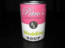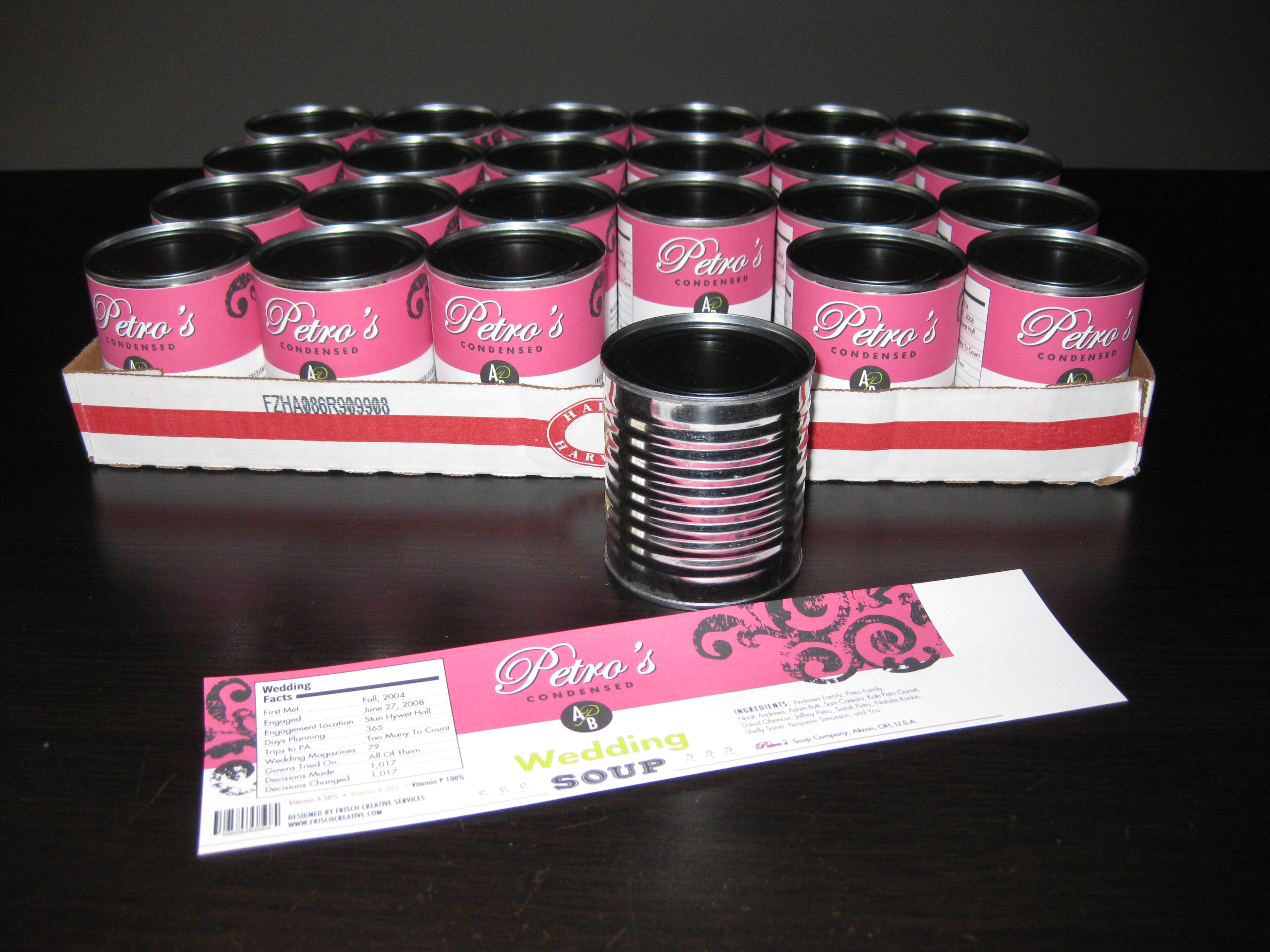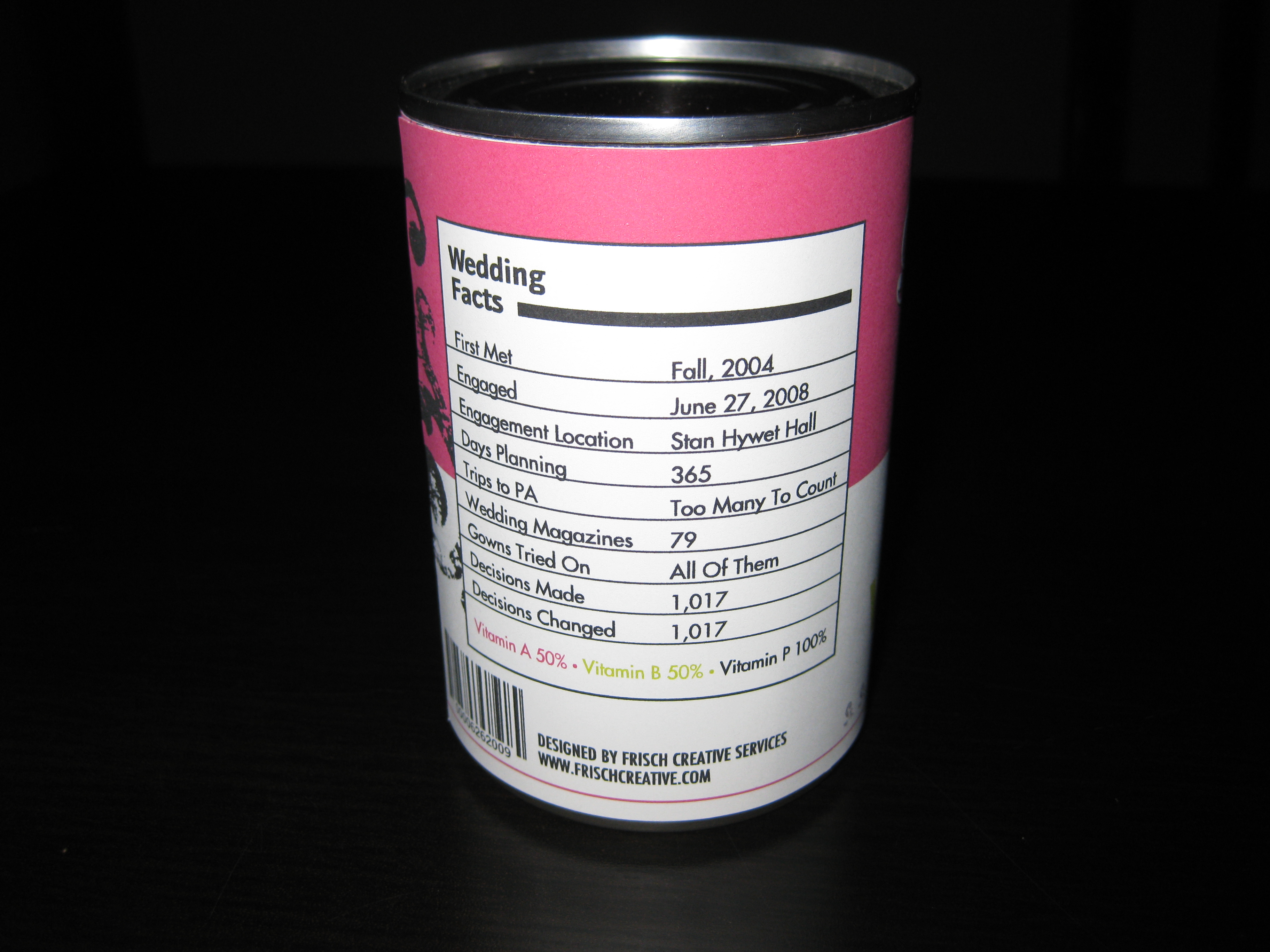 My wife and I worked together with the talented designers at Frisch Creative Services to give our Pittsburgh wedding a modern Pop Art theme. I approached this project just like I would a multimedia advertising campaign. With the concept identified, I looked for creative ways to carry the theme across several different components, including invitations, programs, floral arrangements and – in this example – the wedding favors. Our goal was to capture the essence of the day while sharing fun, behind-the-scenes details about our relationship. The solution was a playful riff on Andy Warhol’s iconic Campbell’s Soup Cans. The hardest part? Painstakingly applying over 300 labels to blank soup cans in two different sizes.
